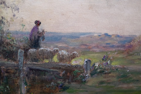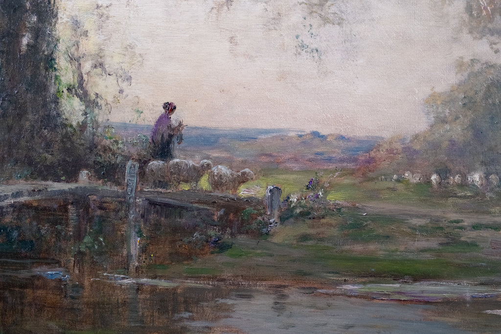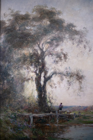 This striking landscape scene depicts a shepherdess and her sheep crossing a small footbridge with the landscape extending out into background. The dominant subject of the landscape is the tree which has been masterfully painted reaching up into the morning sky. The whole work has an almost dream like quality.