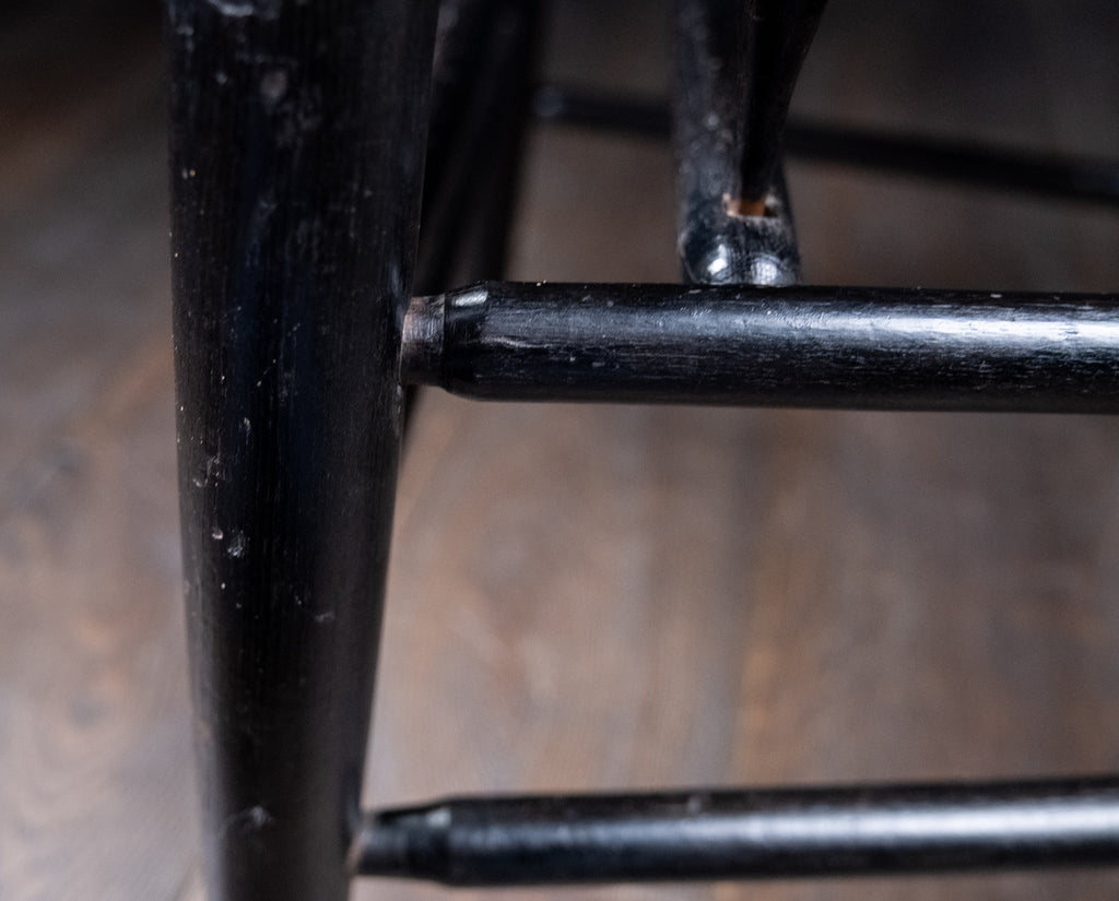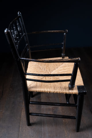 Charming areas of wear to the arm rest from years of use. There is evidence of repair and restoration in areas. The rush seat is later and in excellent order. There have been historic repairs to the supporting seat pegs, and a few stretchers ends are ever so slightly out of their hole (please see photographs). There is a slight movement in the joints but the chair overall is in a good strong usable condition.
