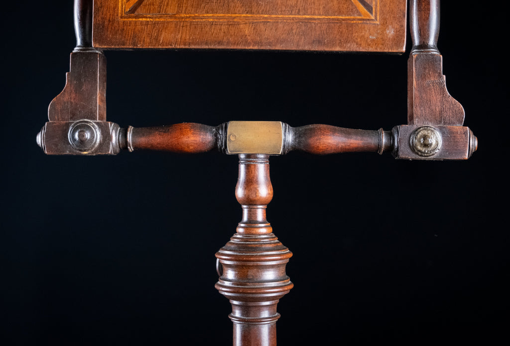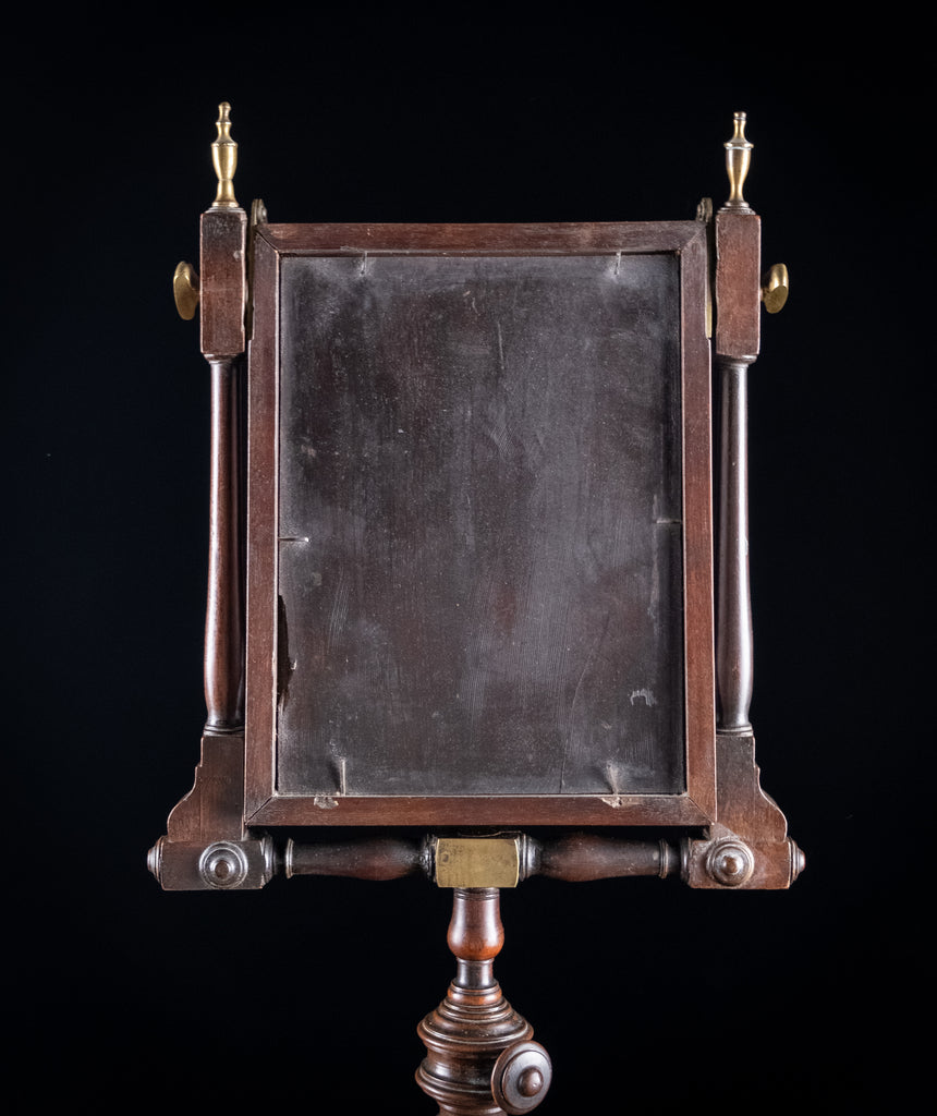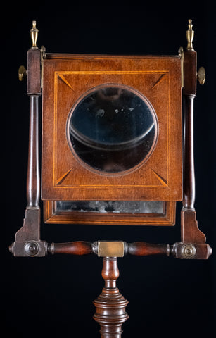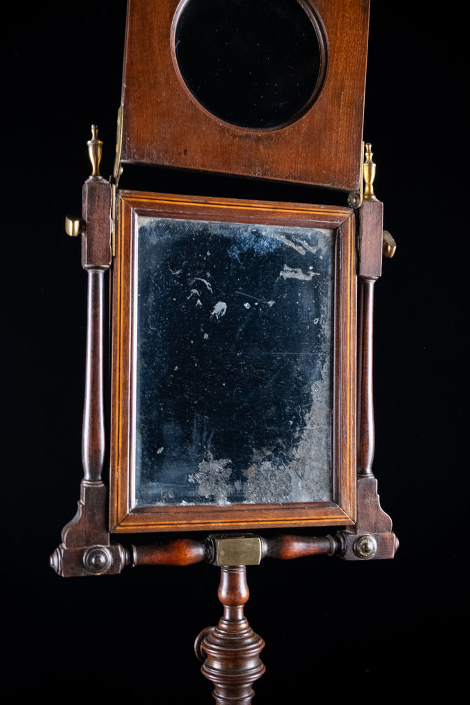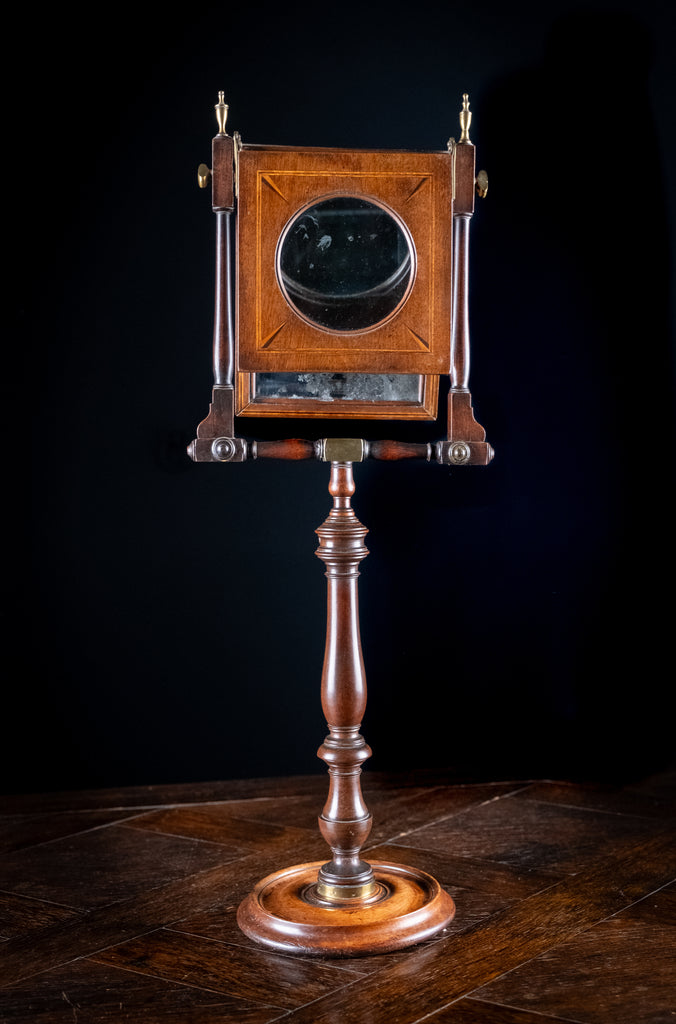 This example has a turned wooden base below a brass band, an extendable stem, inlaid viewing magnifier, original adjustable mirror plate and brass urn finials. The original mirror plate has some foxing but remains fully useable for viewing. There looks to be a sympathetic historic repair to the top of the stem above the which remains strong.