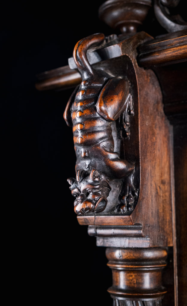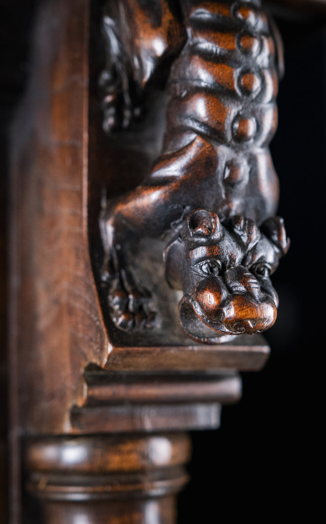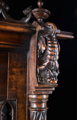 The ogee arched bevelled plate is flanked by intricately carved spiral columns, each surmounted by a finely carved beast, the whole beneath an urn flanked gothic cresting.