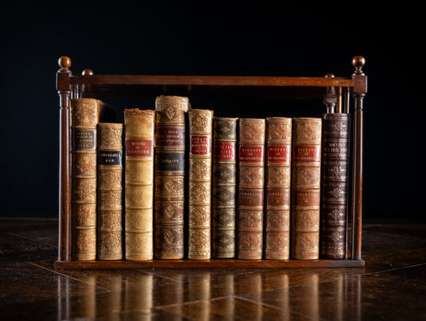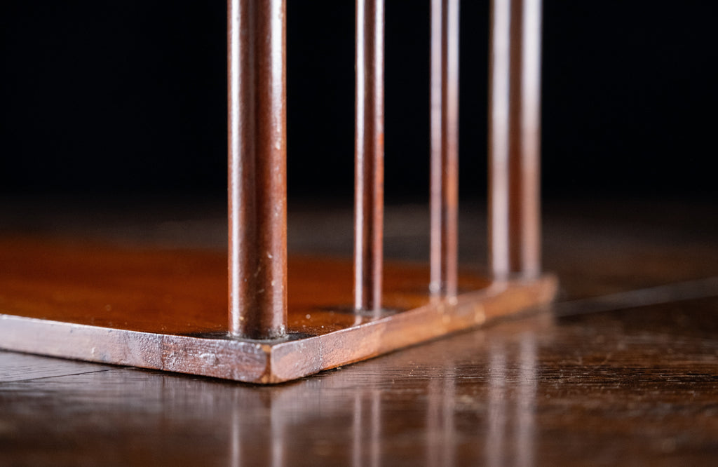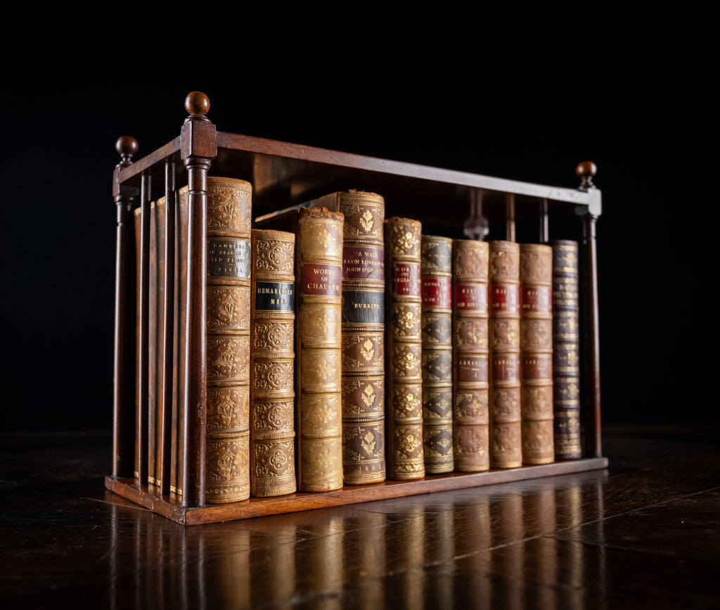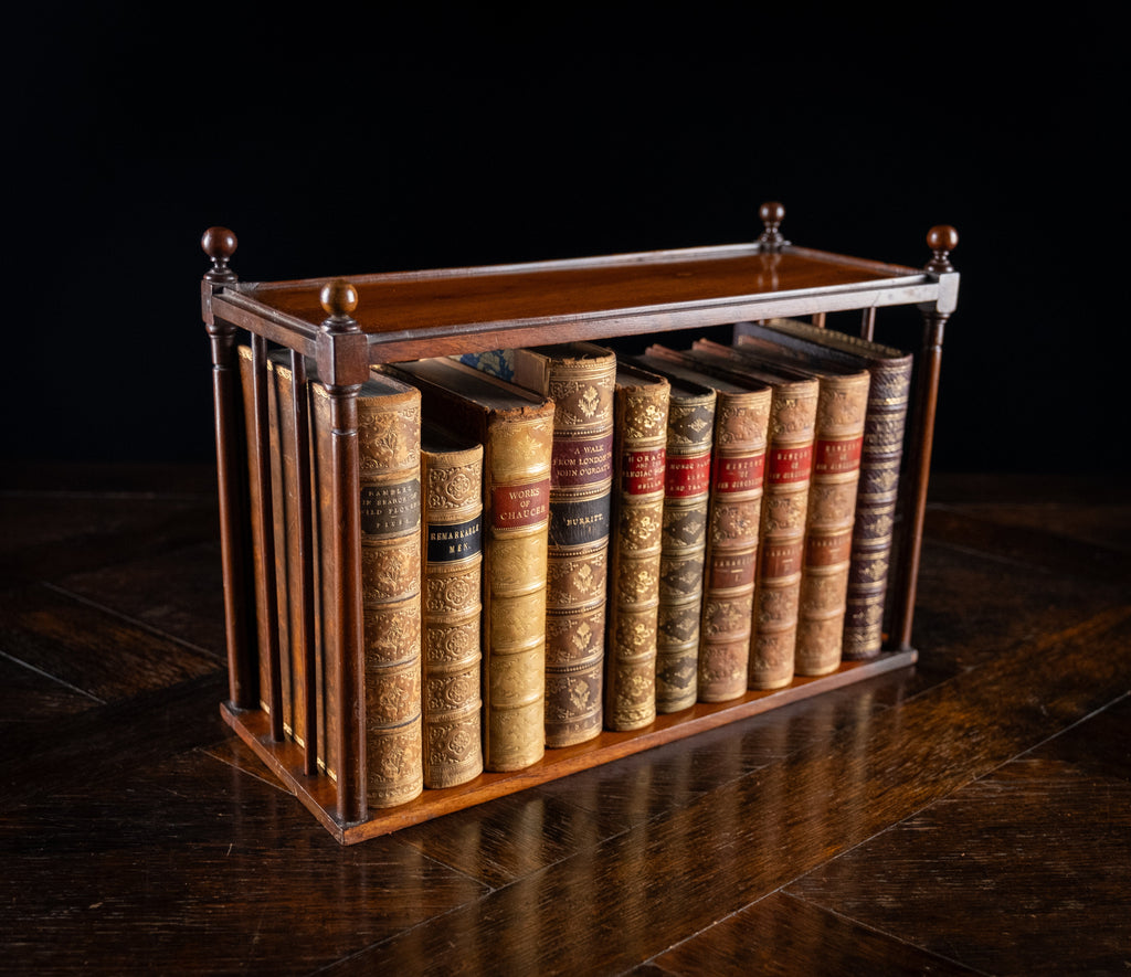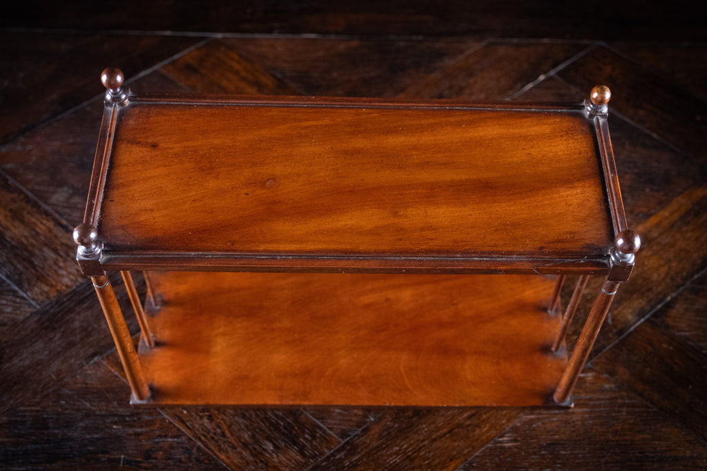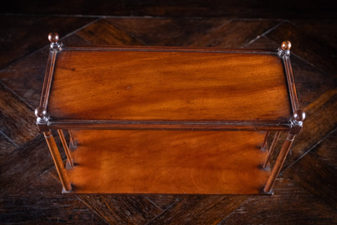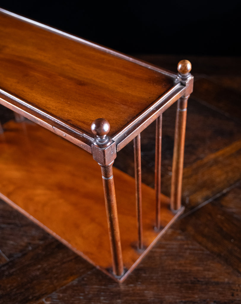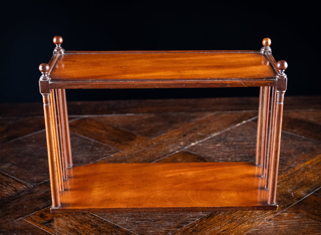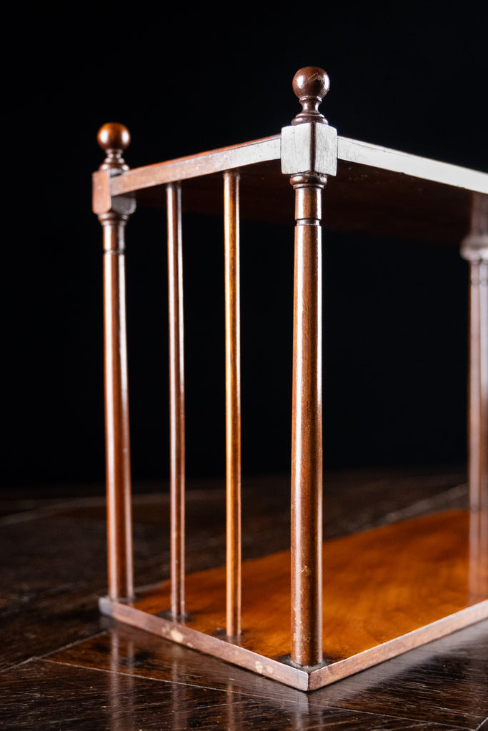 The thin shelves are united by finely turned spindles with the corners terminating in ball finials. The moulding to the top shelf allows for a second shelf of books if desired.