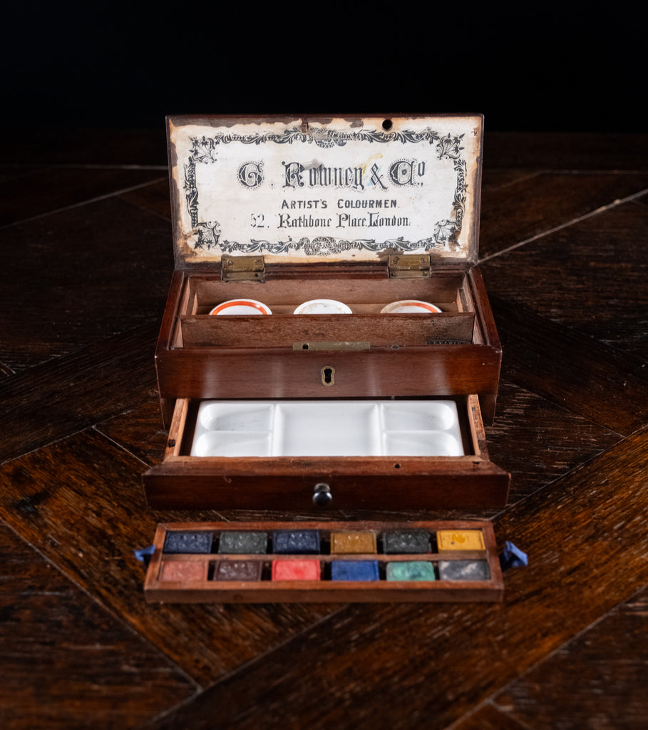 A charming artist's watercolour paintbox by George Rowney & Co. The box label states the company address as 52 Rathbone Place, London; George Rowney & Co are documented as operating from that address between 1854-1862 and dates the box nicely thus. Key absent.