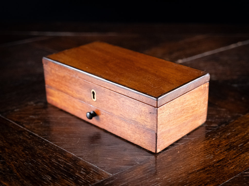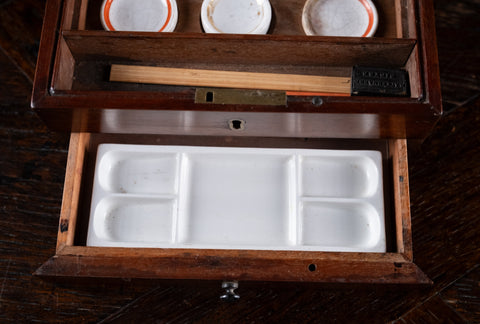 The hinged mahogany lid opens to reveal an array of watercolours, largely untouched, together with a further black watercolour paint block and accoutrements left by the box's previous artist. The bottom tray opens by lifting a pin and reveals a ceramic paint dish. The watercolours lift out to reveal three ceramic mixing dishes.