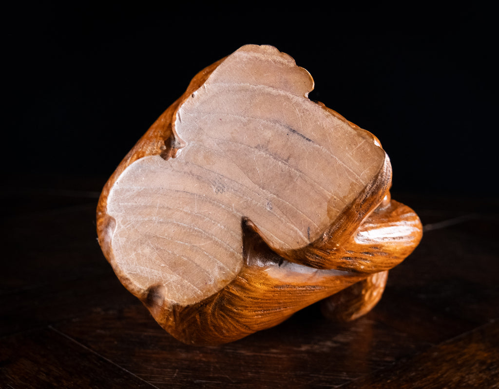 The monkey is sat with its arms resting on its knees in an attentive manner. The carved eyes are painted black and the body has deep grooving throughout to mimic fur.