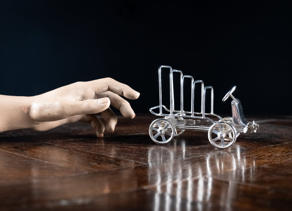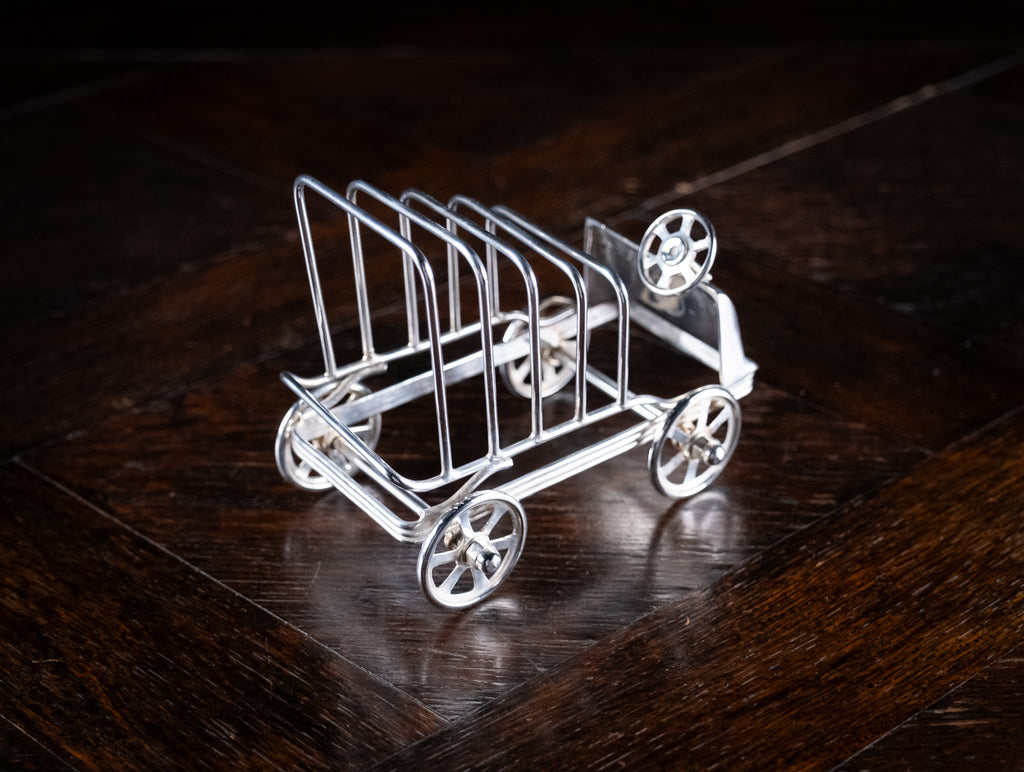 A delightful Edwardian period novelty car toast rack by the Van Bergh Silver Plate Co. (operating 1892 - 1926). Van Bergh stamp clearly to the inside front.