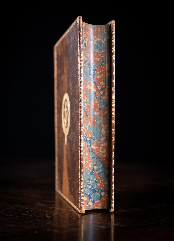 Full tree calf binding by Bickers & Son, Leicester Square London. St Leonard's School crest gilt stamped to the front board (the similarities in design of the crest to the ones of Celtic origin indicate this is St Leonard's School of Fife, Scotland rather than Exeter, Devon). Five raised bands and green leather gilt stamped title panel to the spine. Light shelf wear commensurate with age in areas. Small nick to the bottom of the back board. Generally the whole volume remains in a good attractive condition externally.