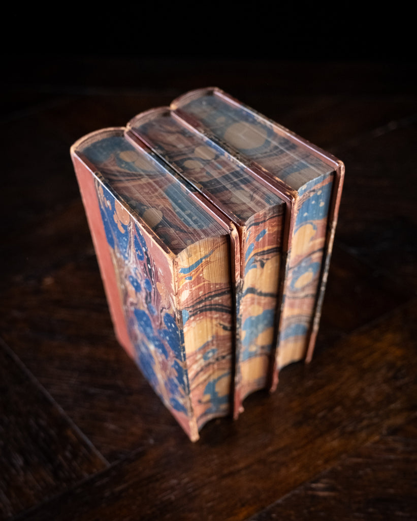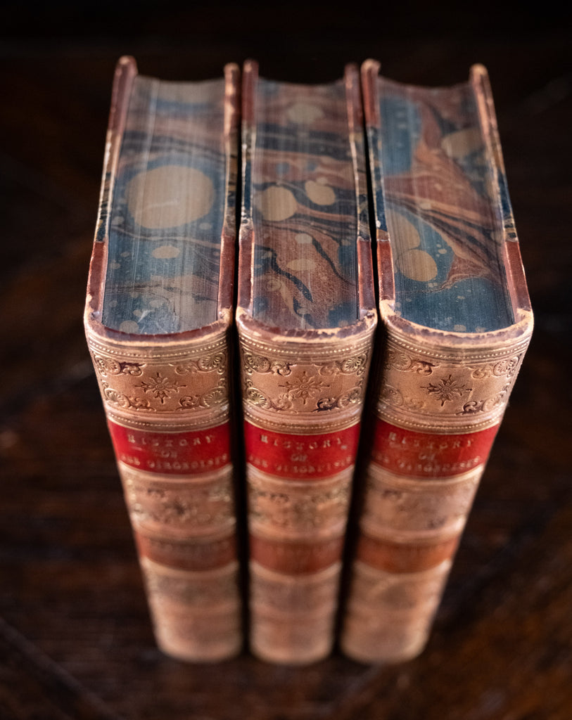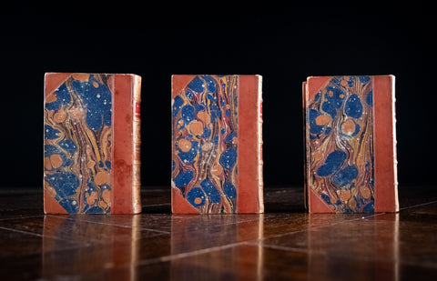 Three quarter bound tan leather with five raised bands and red leather title and volume panels. Marbled boards. There is some light shelf wear to the extremities in some areas but generally all volumes display well.