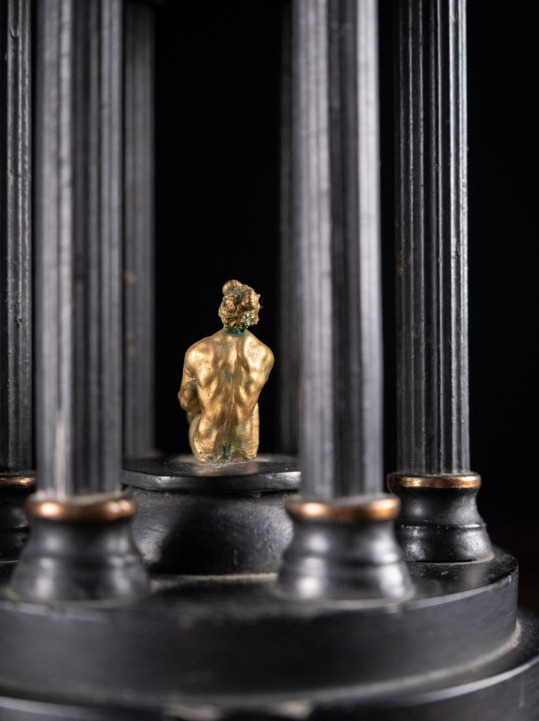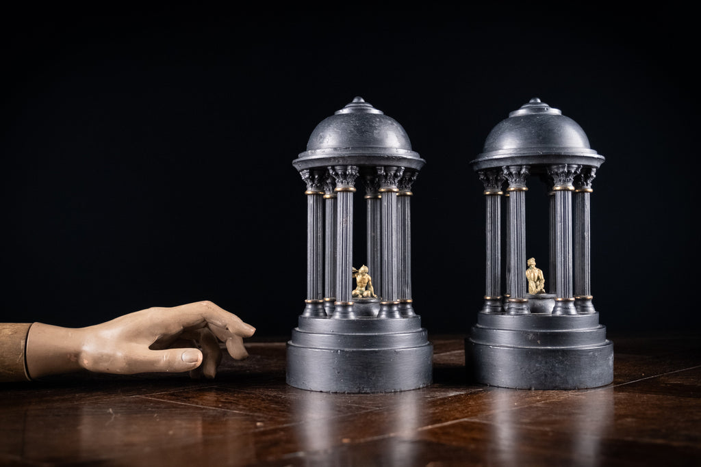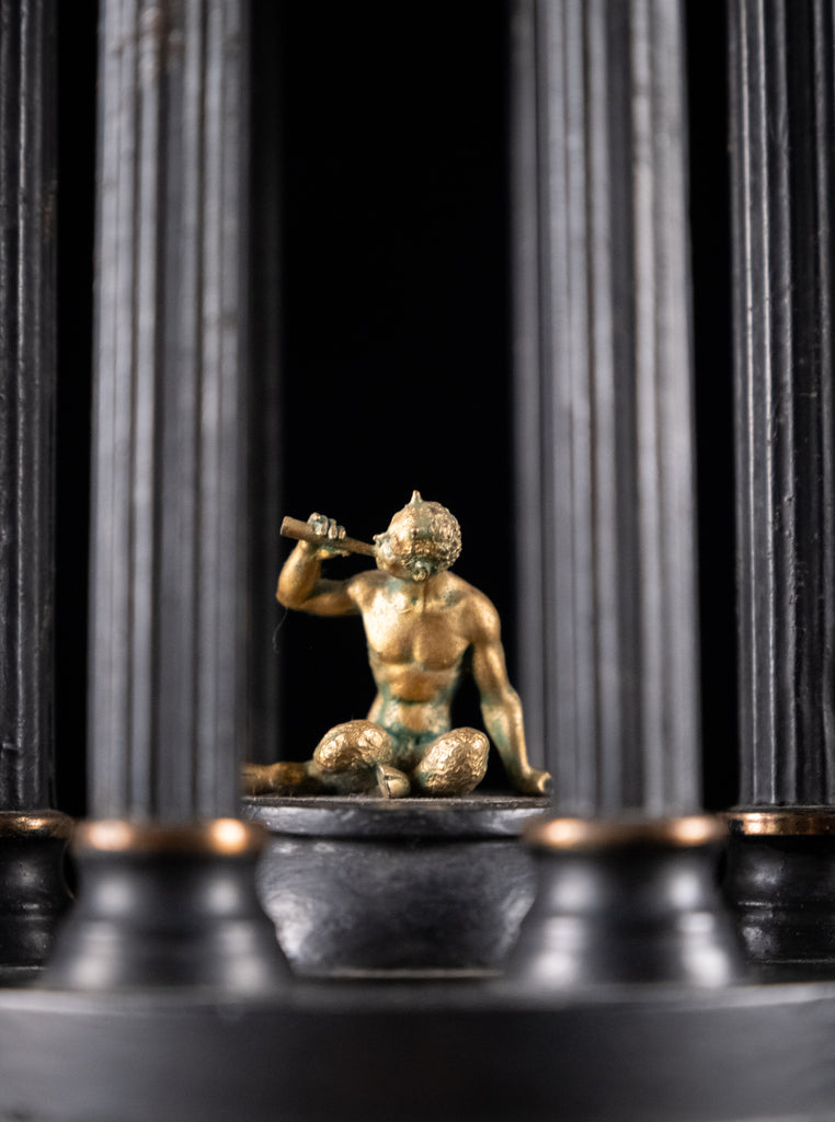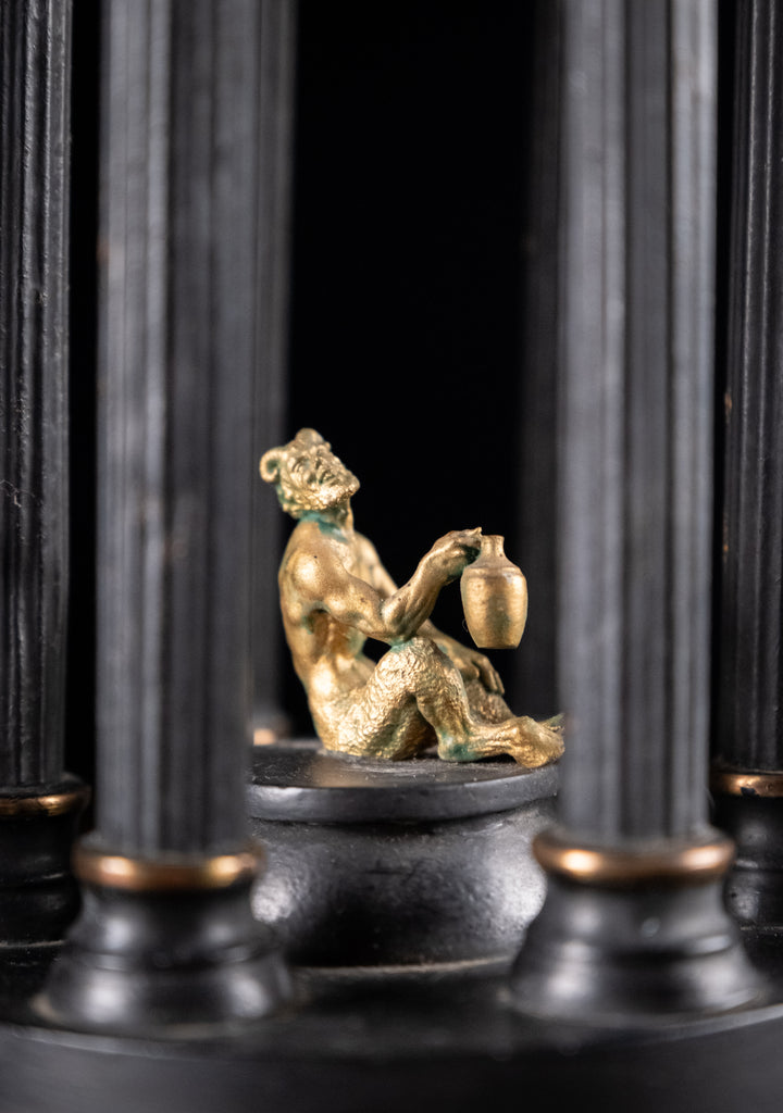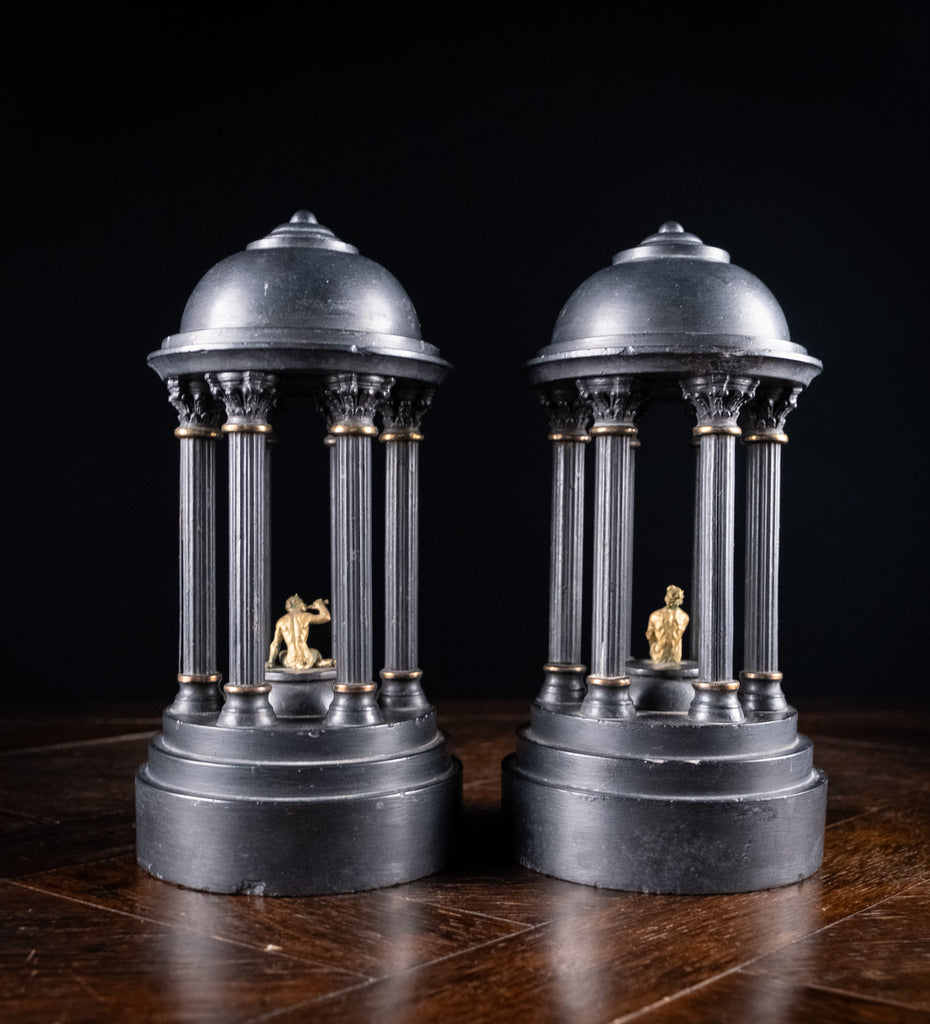 Each model boasts a domed top above six reeded pillars with gilt detailing above a stepped base. The small gilt bronze figures of Bacchus and Pan within each temple are very crisply cast and boast impressive detail.